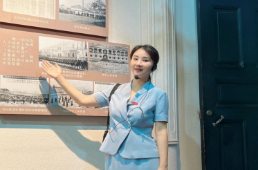 (图为毛泽东与第一师范纪念馆讲解员邹磊正在为同学们讲述展品背后的故事。)