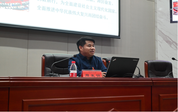 周发明从党的二十大召开的历史背景、大会主要内容、大会的主要成果等三个方面进行了讲授,重点介绍了二十大报告重要内容。周发明指出,党的二十大报告是在全党全国各族人民迈上全面建设社会主义现代化国家新征程、向第二个百年奋斗目标进军的关键时刻召开的一次十分重要的大会。大会报告,回顾总结了过去五年的工作和新时代十年的伟大变革,阐述了开辟马克思主义中国化时代化新境界、中国式现代化的中国特色和本质要求等重大问题,擘画了全面建成社会主义现代化强国的宏伟蓝图和实践路径,就未来五年党和国家事业发展制定了大政方针、作出了全面部署。