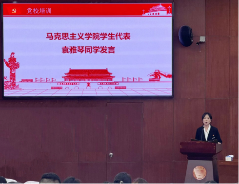 在马克思主义学院学生代表袁雅琴同学发言中,她向大家展示了自己为向党组织靠拢所做的努力,并表示:“作为一名入党积极分子,我将更加严格地要求自己,希望与各位一同认真上好党课,端正自己态度,学习党的先进思想,争做强国建设的榜样和先锋!”