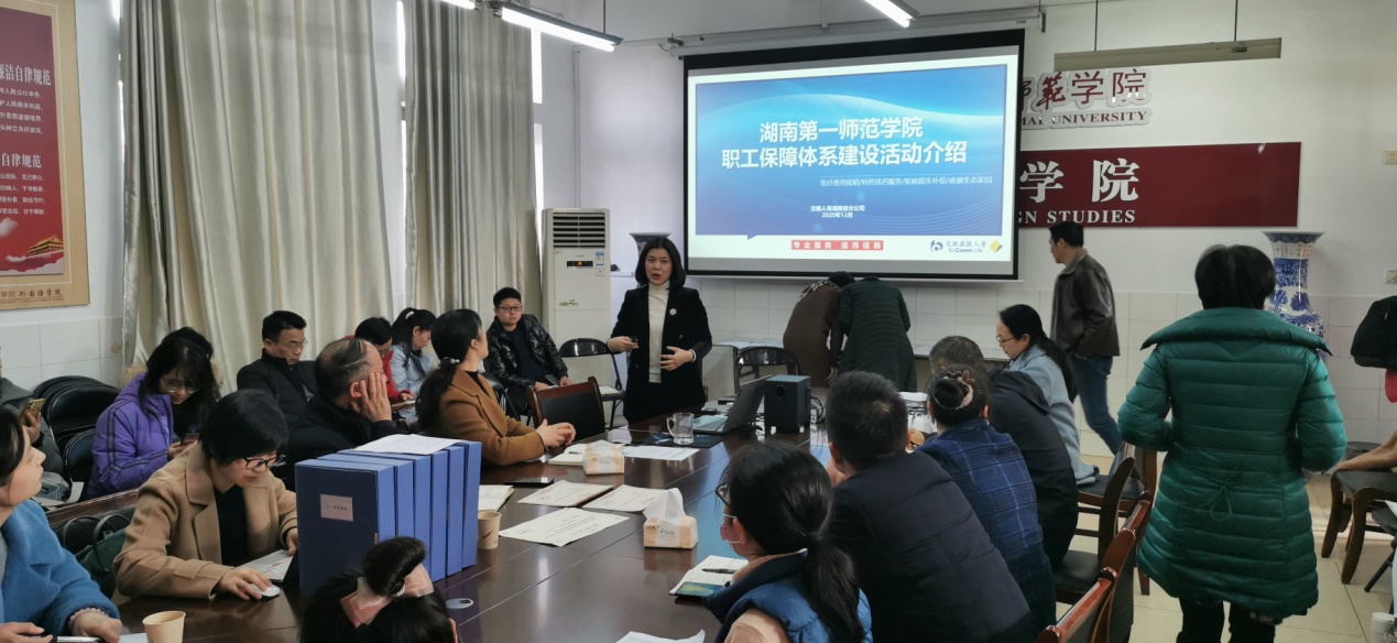 为积极推进教职工大病保障体系建设,校工会与交银康联人寿湖南分公司合作,搭建了教职工大病保障免费领取361服务与保险团购平台。院分工会积极响应校工会号召,于2020年12月22日在院会议室举行了交银康联人寿保险公司专场宣讲会。