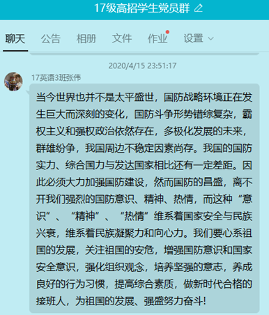 活动开展期间,全体党员踊跃发言,纷纷在线上交流学习心得。“安而不忘危,存而不忘亡,治而不忘乱。居安思危强调的是一种安全意识,只有保持警惕,才能更好的珍惜来之不易的和平发展局面。我们应该提高警惕意识,提高自己辨别网络信息的眼力,坚定地维护国家统一,为国家繁荣发展献力献策。”参与活动的学生党员彭乐表示。