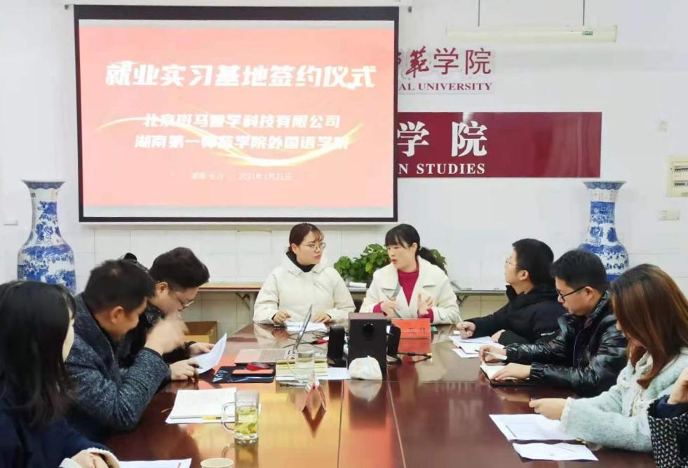2021年1月21日上午,我院与北京斑马智学科技有限公司签订了校企合作实习就业基地协议。学院党总支书记李亚林、党总支副书记杨虎智、北京斑马智学科技有限公司长沙分公司人力资源经理郎苗苗,以及双方代表等共13人参加签约仪式。