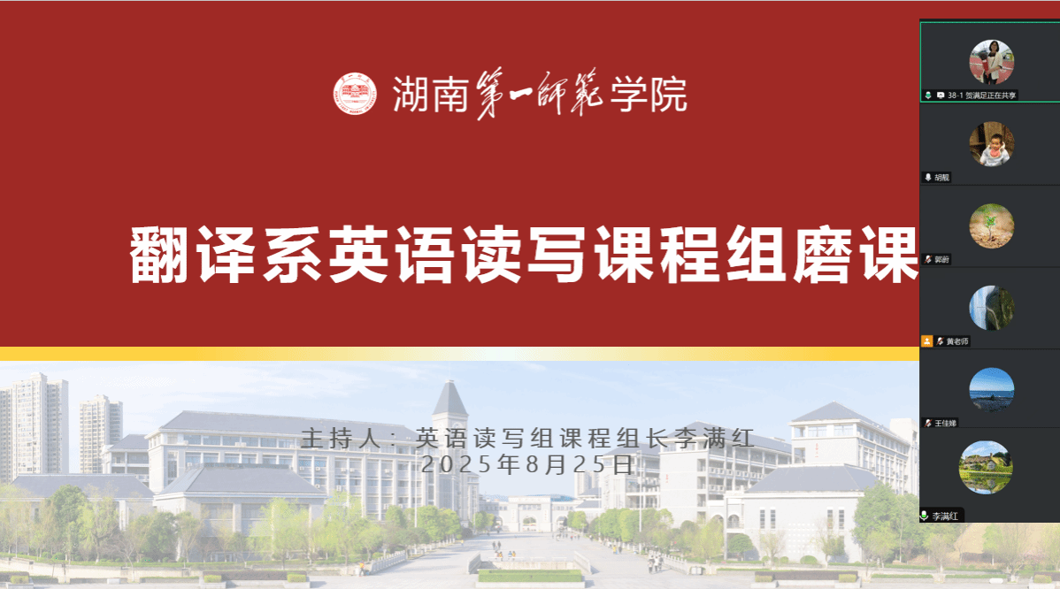 为进一步提升英语专业阅读课程教学质量,夯实教师课堂教学能力,优化教学设计与教学方法,2025年8月25日,伟德betvlctor1946源于英国翻译系英语读写课程组以 “聚焦阅读素养,打造高效课堂”为主题,组织开展了英语阅读课程专题磨课活动。本次活动由贺满足老师主讲,王佳娣副院长、胡靓博士、郭蔚老师、黄春莲老师和李满红老师参会,共同研讨《英语阅读(一)》课程优化路径。