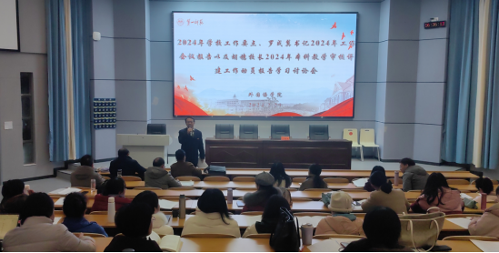 会上刘祥清领学了2024年学校工作要点,介绍了学校工作大会报告的主要精神,副院长(主持工作)陈圣白、副院长唐文杰分别结合学院工作和本科教育教学审核评建工作对大会报告进行了解读,提出学院2024年的工作计划和要求。院长助理、系(教研室)主任、支部书记以及教授和博士代表积极发言,发表学习报告的感受,提出意见和建议。副校长彭晓辉全程参加本次学习研讨,回应了教师关切,并就外院2024年工作开展提出了具体要求。会议形成了以下意见: