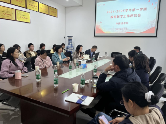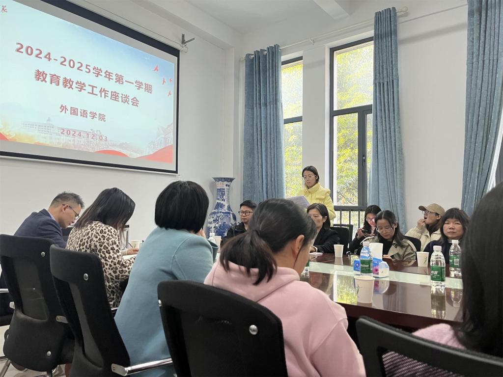 为提高教育教学质量,优化课程设置,确保教育工作能够紧密贴合学生的发展需求,营造出更优质、更高效的教学环境,助力学生全面成长,2024年12月3日下午,我院在百熙楼223召开2024-2025学年第一学期教育教学工作学生代表座谈会。院党委副书记戴建宇,副院长陈艳君,教科办主任廖爱秀,英语系、翻译系主任、备课组组长及22级、23级学生代表参加本次会议。会议由陈艳君副院长主持。