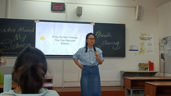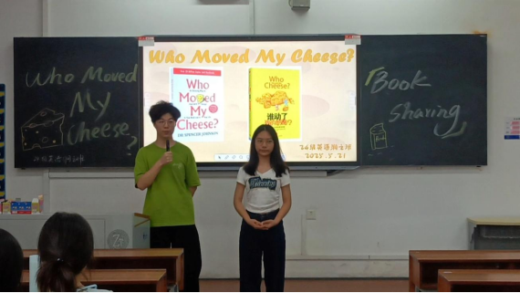 5月21日下午,24级英语润之班在城南校区火炬图书馆301教室举办了以“变化中的智慧,成长中的启迪”为主题的读书分享会。本次活动围绕美国作家斯宾塞·约翰逊的经典著作《谁动了我的奶酪》展开,这既是对大一一整个学年读书活动的收官之作,也是同学们展现一年来成长与蜕变的舞台。班主任Mindy老师出席本次活动,与同学们共话变化与成长的深刻主题。