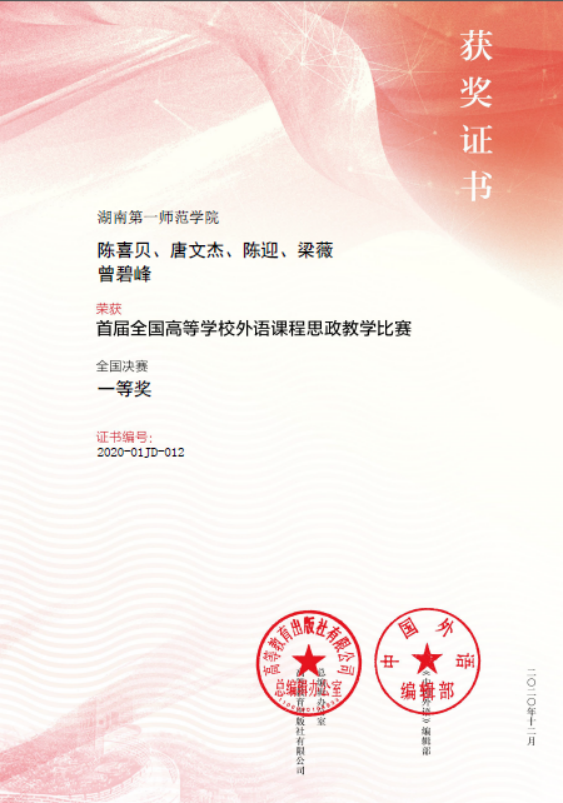 2020年以来,“综合英语”“教师英语口语”两门课程立项湖南省课程思政示范课程;湖南省课程思政名师9位;“一师故事英语说”“毛泽东诗词英译赏析”两门课程的教学团队立项为湖南省课程思政联盟优秀团队。
