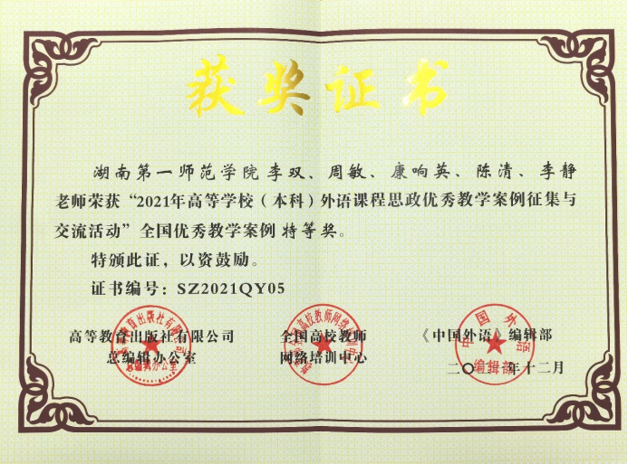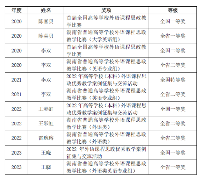 2020年以来学院每年选派教师参加湖南省外语课程思政比赛和全国课程思政案例征集与交流活动,连续4年荣获全国特等奖1项、全国一等奖2项、全国二等奖1项、全省一等奖2项、全省二等奖4项。