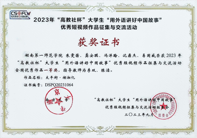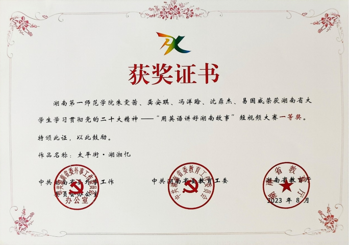 由湖南省课程思政专家、全国外语课程思政特等奖获得者李双老师指导的作品“太平街·湖湘忆”荣获湖中共湖南省委外事工作委员会办公室、中共湖南省委教育工委、湖南省教育厅主办的湖南省大学生学习贯彻党的二十大精神——“用英语讲好湖南故事”短视频大赛一等奖,并在高教社杯“用外语讲好中国故事”优秀短视频作品征集与交流活动中荣获一等奖。